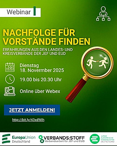 Die Europa-Union Deutschland (EUD) ist die größte Bürgerinitiative für Europa in Deutschland. Unabhängig von Parteizugehörigkeit, Alter und Beruf engagieren wir uns für die europäische Einigung. Wir sind aktiv auf lokaler, regionaler, nationaler und europäischer Ebene. Rund 18.000 Mitglieder sind in 16 Landesverbänden mit rund 350 Kreis-, Orts- und Stadtverbänden vernetzt und haben Partnerorganisationen in über 30 Ländern Europas.