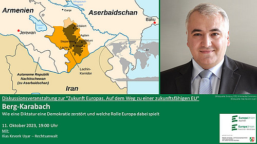 Im Rahmen des Projektes Zukunft Europas: Auf dem Weg zu einer zukunftsfähigen EU laden die Europa-Union NRW und die Europa-Union Aachen zu einem Onlinegespräch über die aktuelle Lage in Berg-Karabach ein. Das Gespräch mit Rechtsanwalt Ilias Kevork Uyar wird am 11. Oktober ab 19 Uhr über die Plattform Zoom stattfinden. » weiterlesen