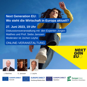 Next Generation EU: Wo steht die Wirtschaft in Europa aktuell? Interaktive Online-Diskussionsveranstaltung am 27. Juni 2023, 19 Uhr via Zoom Mit Jürgen Matthes, Wirtschaftswissenschaftler am IW Köln (Institut der deutschen Wirtschaft) und Prof. Siebo Janssen, Europa-Experte Moderation: Jochen Leyhe   » weiterlesen