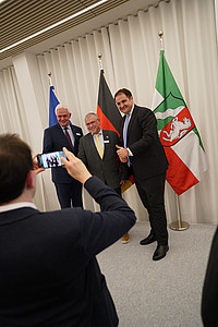 (Peter W. Wahl mit Minister Nathanel Liminski (r.) und Dr. Günther Bergmann (l.) beim Jubiläum der Europaschecks am 14.11., Bildrechte: Robin Teller STK)