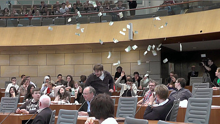 Auf Einladung von Landesregierung und Landtag kamen am Europatag 350 Jugendliche in Düsseldorf zusammen zum Aktionstag „Wir sind Europa - Wir haben die Wahl“. Im Mittelpunkt stand das Theaterstück "Die Euro-WG“ mit einer Aufführung im Plenarsaal. In einer imaginären Wohngemeinschaft streiten hier ein Italiener, eine Griechin, eine Finnin und ein Deutscher, versöhnen sich und diskutieren leidenschaftlich: über Geld, Solidarität und die Zukunft - so wie die europäischen Staaten auch. Es geht heiß her, es wird gekocht, getanzt und gefeiert - auch auf den Tischen. Als mitwirkende Europa-Experten brillierten dabei die NRW-Europaministerin Dr. Angelica Schwall-Düren und der ehemalige Europaminister und jetzige Vorsitzende der Europa-Union NRW, Wolfram Kuschke mit schauspielerischen Talenten. Die WG-Bewohner holten immer wieder die jungen Zuschauer ins Stück und berieten auch mit ihnen über Lösungen für die Probleme der WG wie auch der Europäischen Union.