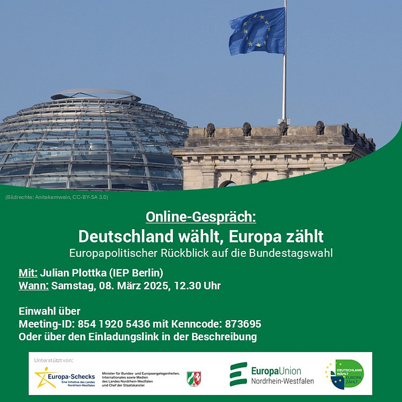 Die Kampagne “Deutschland wählt, Europa zählt” in NRW wird von der Landesinitiative Europa-Schecks des Ministers für Bundes- und Europaangelegenheiten, Internationales sowie Medien und Chef der Staatskanzlei des Landes Nordrhein-Westfalen unterstützt.